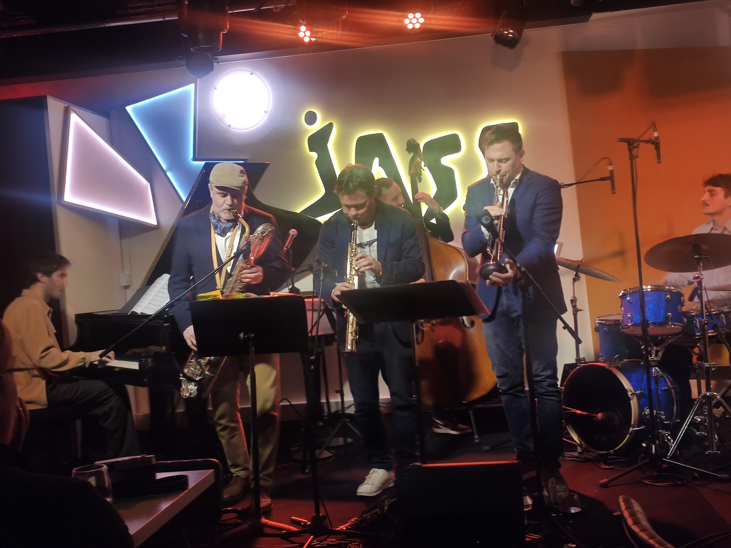 Le bassiste Pierre Marcus a formé ce dimanche un sextet, comme aimait le faire Charles Mingus, pour jouer quelques chefs-d’œuvres de cet immense jazzman. Baptiste Herbin, saxo alto, soprano, Jean Philippe Scali, saxo baryton, Bjorn Ingelstam, trompette, Simon Chivallon, piano, Pierre-Eden Guilbaud, batterie, se sont amusés avec talent à interpréter avec fougue entre autres, Fables of Faubus, Haitian Fight Song, Reacarnation of a love bird, Moanin’, Better Get It On Your Soul…. L’ombre des musiciens de Mingus planaient donc sur ce lieu, qui après bien des vicissitudes, dur dur de monter une salle de jazz à Paris. se nomme depuis peu, Jass Club. L’endroit est superbe, le décor, le son, le service, tout est fait pour que l’on passe une bonne soirée.