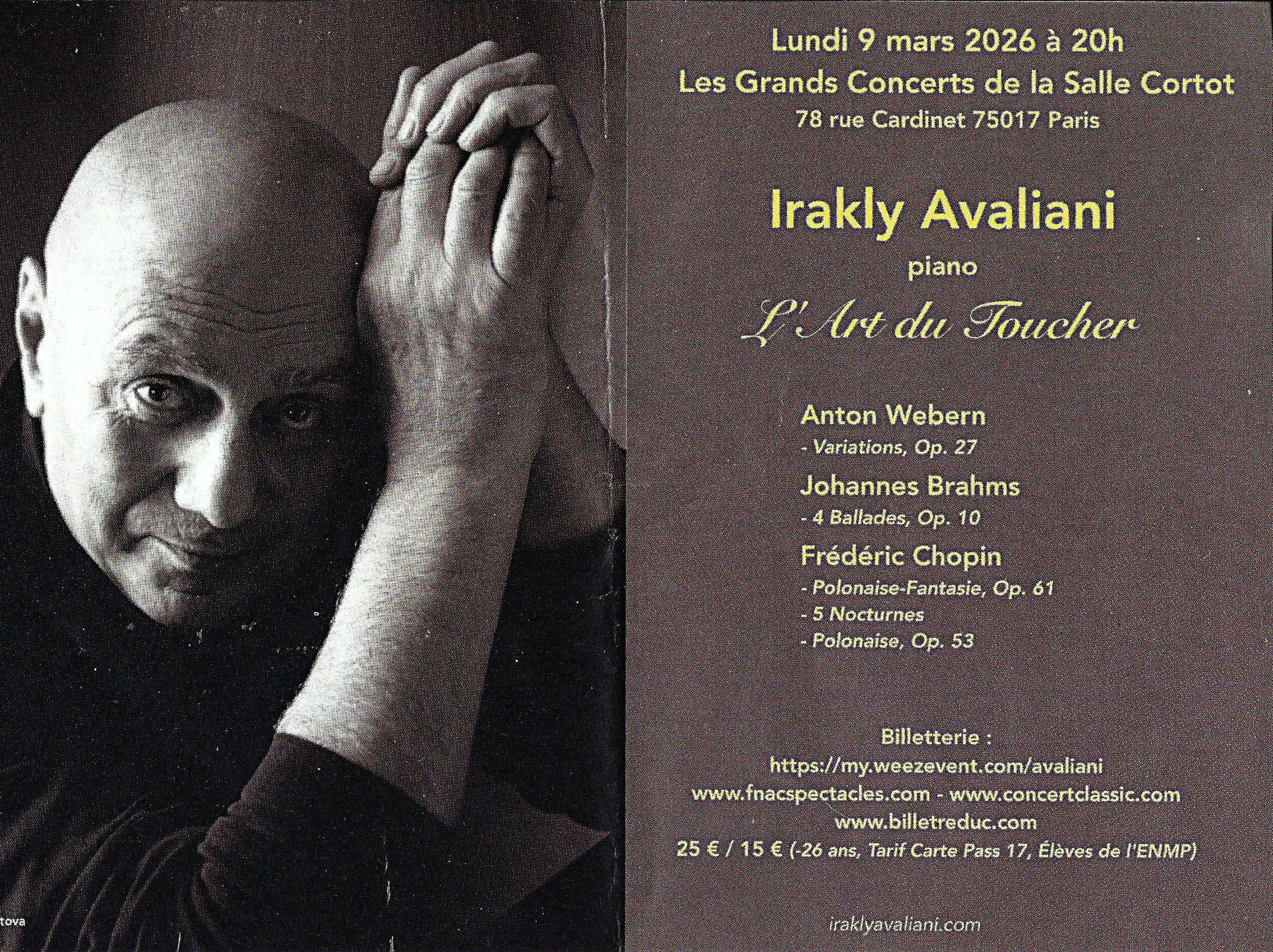 Irakly Avaliani nous en avons souvent parlé sur le site tant au niveau de ses concerts que de ses albums. Ce concert d’hier soir était tout en intimité. On connait l’art de jouer du piano de Avaliani, de caresser les touches. Là avec ce programme on était en pleine introspection de l’artiste. Les Variations de Webern, ce sont quelques notes habilement agencées qui, mises en miroir, avec les ballades de Brahms, donnaient aux compositions de ce dernier des accents de modernisme, de romantisme, sans sentimentalisme. Cette douceur, cette lenteur même, nous la retrouvions dans les 5 nocturnes de Chopin, une manière tout à fait personnelle de les interpréter. Même la Polonaise-Fantaisie il en fait sienne.